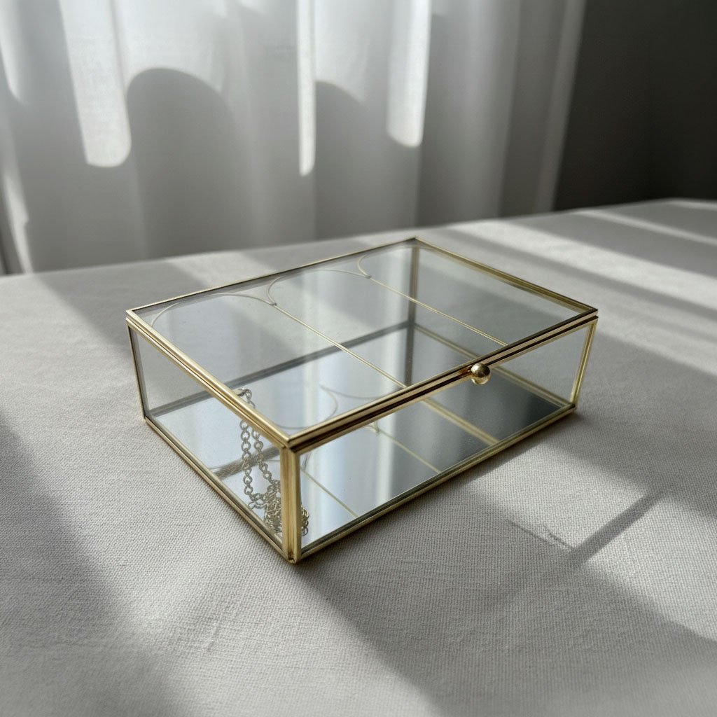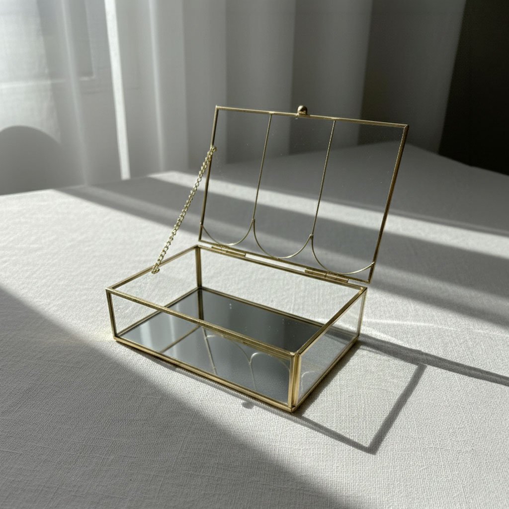 Architectural Elegance for Your Daily Rituals. This sophisticated rectangular jewelry box is handcrafted from premium brass-finished metal and high-clarity glass. The standout feature is its uniquely designed lid, adorned with three delicate arched accents that evoke a sense of modern architectural grace. Featuring a high-definition mirrored base and a secure hinged lid with a protective safety chain, this box offers a brilliant and organized display for your most cherished rings, necklaces, and accessories.